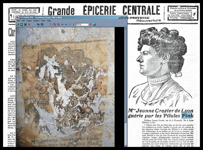Une pub : Jeanne Crozier de Lyon guérie par les pilules Pink. 2 novembre 1911 ! J'ai manifestement retrouvé la coupure de journal, puisque tout dans la présentation et du texte en dessous correspond.