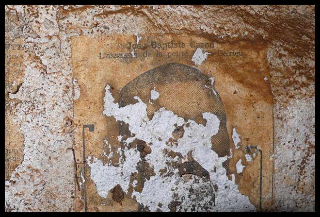 Sur ces articles de presse accrochés au mur, l'un deux évoque le meurtrier suivant : Jean-Baptiste Caron. Sur lequel je trouve : Le jeune valet de chambre qui égorgea et mutila, à Versailles, le 22 octobre 1911, la petite marchande de journaux Marie Delrieu, ne rendra pas compte à la justice de son odieux forfait. Depuis son arrestation, Caron simulait, croyait-on, la folie. Soumis d'abord, à la prison de Versailles, à une expertise, il fut ensuite, au mois d'août 1912, conduit à la Conciergerie, à Paris, où les docteurs Valon, Roubinovitch et Gilbert Balet l'examinèrent à nouveau pendant plusieurs mois.