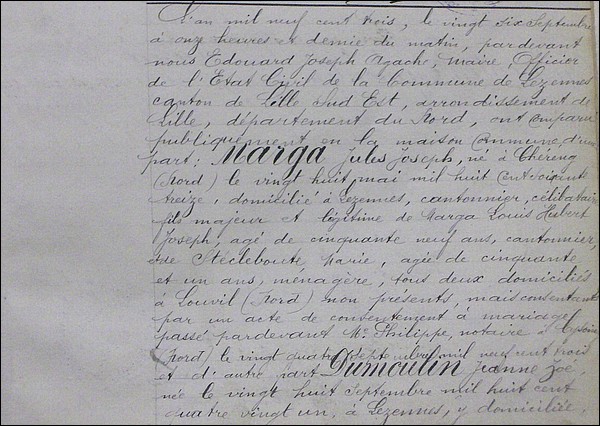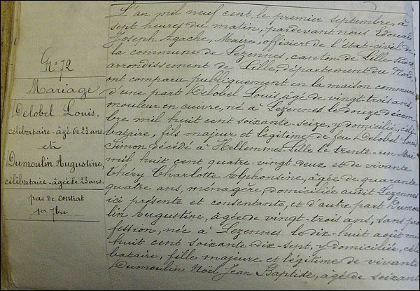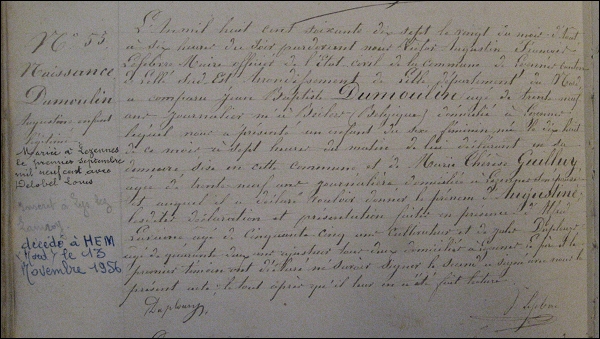 Une chose indéniable que l'on peut dire, c'est que de par la branche maternelle et paternelle, les Dumoulin sont belges. Thérèse née Gheluy et mariée Dumoulin, était originaire de Dergneau. Il s'agit d'un hameau de Frasnes-lez-Anvaing. Elle était mariée à Jean, Baptiste, Noël Dumoulin, que nous résumons à Jean Dumoulin. Au sujet de Jean, ce dernier est natif de Beclers, en Belgique de même. Il s'agit d'un hameau de Tournai. Nous avons donc indéniablement affaire à des belges installés à Lezennes.