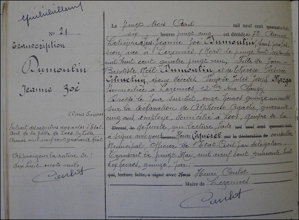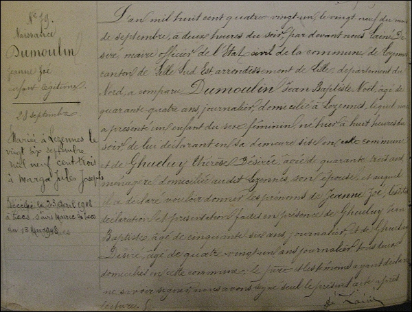 Au sujet de Jeanne, il faut préciser que les inscriptions de son prénom sont rares. Après, peut-être signait-elle simplement Dumoulin, sans prénom. Nous n'en savons rien. Elle est 3 ans plus âgée que Zoé. Elle se marie à 22 ans avec Jules Marga. Les deux sont enterrés au cimetière de Lezennes dans un caveau commun. Elle a pour enfants Marie et Jeanne, lesquelles décèdent aux âges canoniques respectifs de 90 et 88 ans. De Jules Marga, nous ne trouvons aucune inscription. Jeanne et sa famille logeaient rue Chanzy, 12 ter, un lieu que l'on retrouve parfois nommé Cour Marga. Du 12 ter, il ne reste rien, par contre il existe effectivement une petite maison deux façades au numéro 12. Loin de nous l'idée d'affirmer que c'était là. Il existe à côté du 10 un vaste corps de ferme. C'était peut-être dans ces environs là. Jeanne décède à 66 ans à Loos. Elle était toujours domiciliée rue Chanzy.