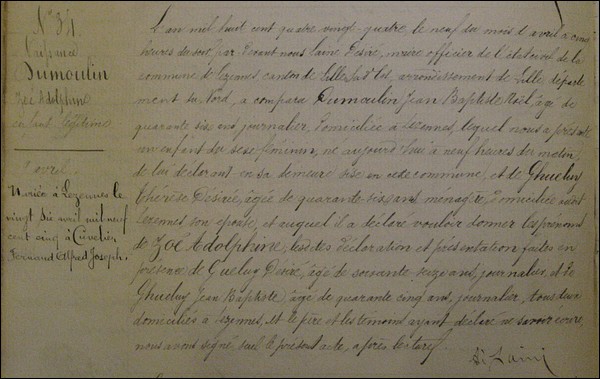 Le domicile des parents possédait-il un puits ? Ils habitent rue Faidherbe, sans numéro. Donc tout est possible. Signalons que la plus grosse concentration de noms Dumoulin se trouve à proximité de la mer de porcelaine, donc pourquoi pas. Sans numéro, cela peut être aussi bien proche qu'éloigné.