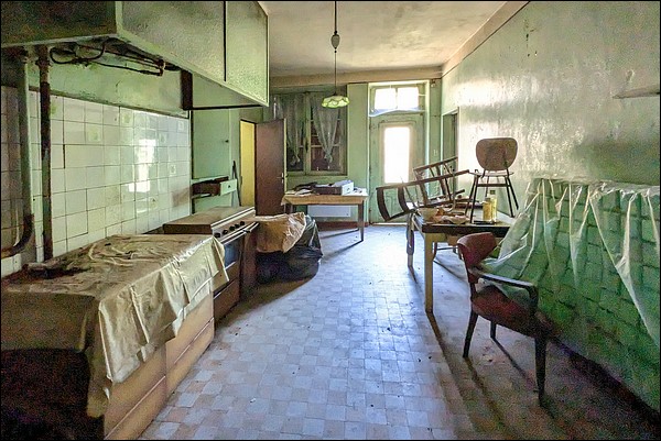 When I climb up behind this vast building constructed on high ground, I realize it is wide open: there has been theft, as usual. In short, even in the deepest countryside, nothing remains untouched. The interior of the house is structured entirely like a small country hotel: upstairs bedrooms surrounding a hallway, a large hotel-style kitchen, and a reception room for breakfast.