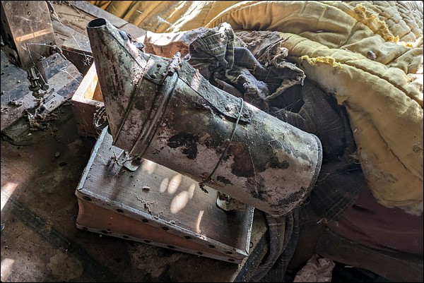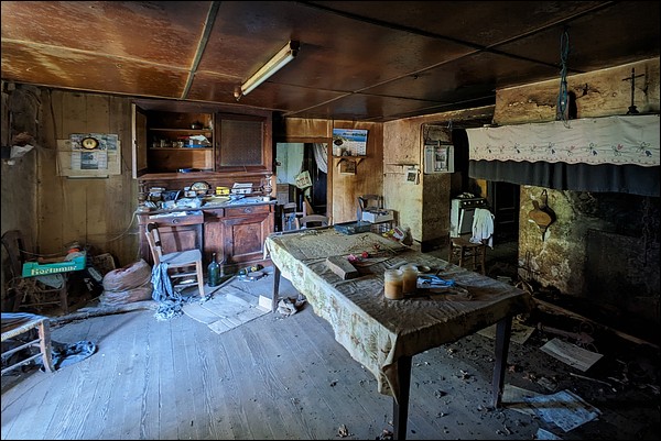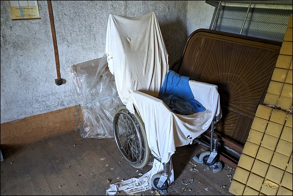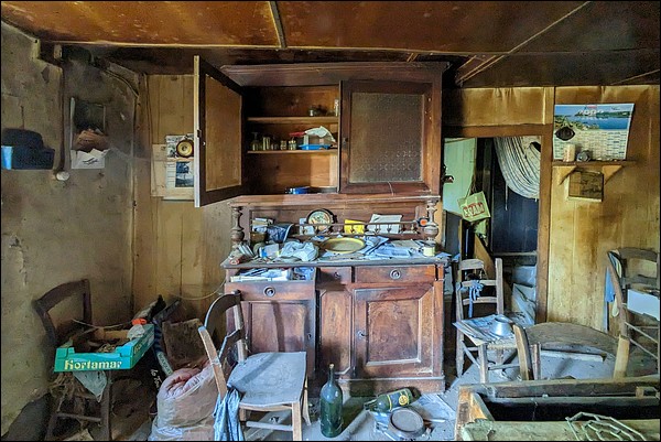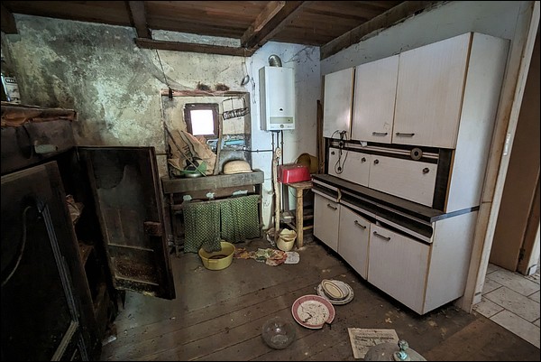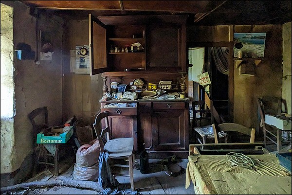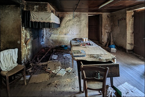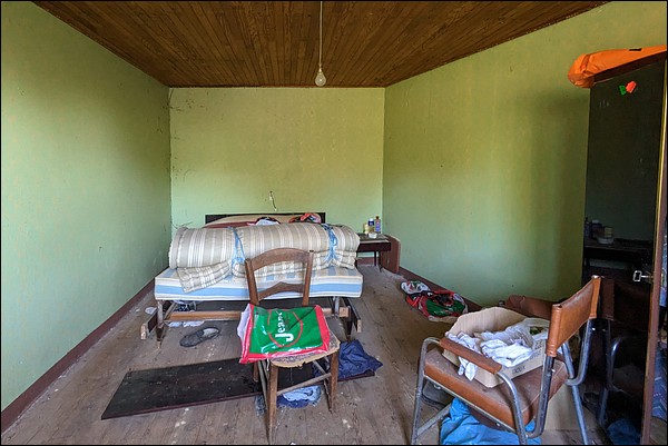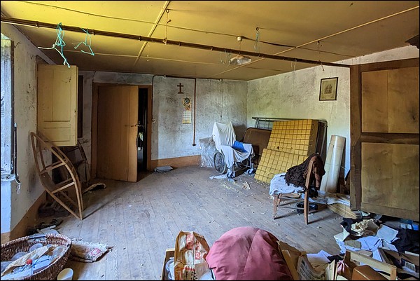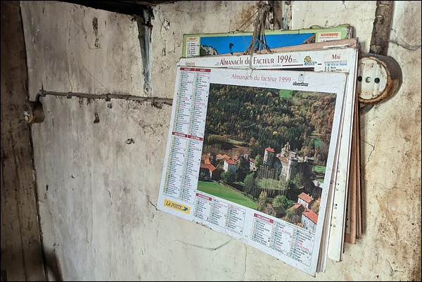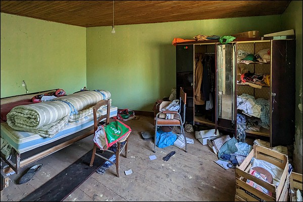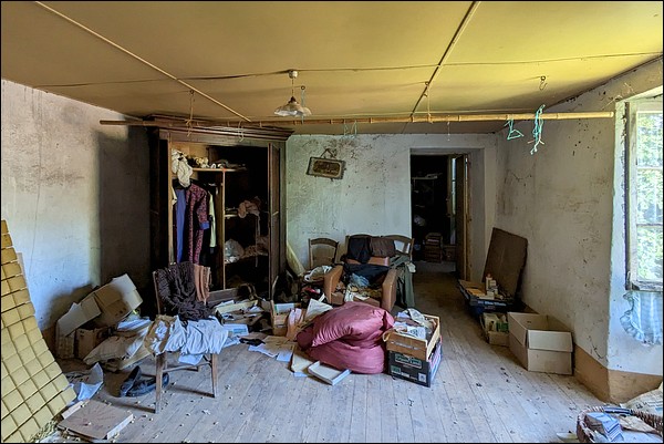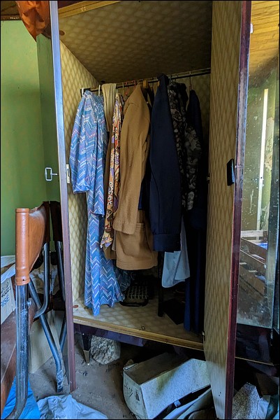 In the bedroom, the wardrobe contains only a lady's clothes: these belong to Emma. I quickly noticed the state of deep abandonment of the place from its overall appearance: there is no longer any electricity or sign of life; the last mail and calendars date back to "forever ago." Furthermore, it is wide open—I closed things up as best I could to prevent animals from getting in.