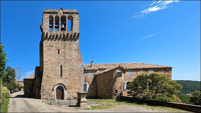 Eglise documentée en drone. L’édifice est doté de deux cloches, disposées dans un clocher peigne. Un escalier en rajoute permet de monter dans un petit édifice sur la gauche de l’église. La première est une Baudouin frères, fondeurs à Alès. C’est celle de droite. Plutôt tardive, créneau de datation envisageable 1845 - 1850. Ils ont inondé la région, c'est un instrument commun. Celle de gauche est une anonyme, qui semble fort intéressante, bien que l'épigraphie soit usée par le temps. Une datation de 1600 est probable.