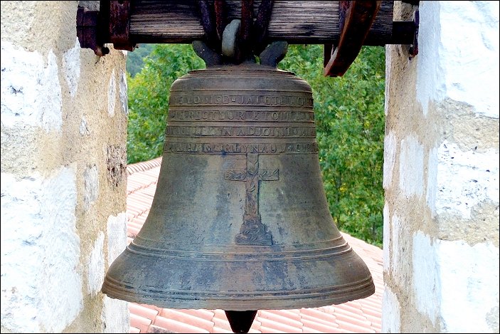 Le clocher est haut et les murs ont des formes qui provoquent des réverbérations d’ondes ; de ce fait, il n’a pas été évident de piloter et il a été joué la prudence. La cloche ne fait pas apparaître de nom de fondeur. La typographie relativement spécifique de la dédicace, la métallurgie et la forme des anses font penser à une Valeton, datée de plus ou moins 1770. Nous avons peu de doutes à ce sujet, les A étant totalement concordants.