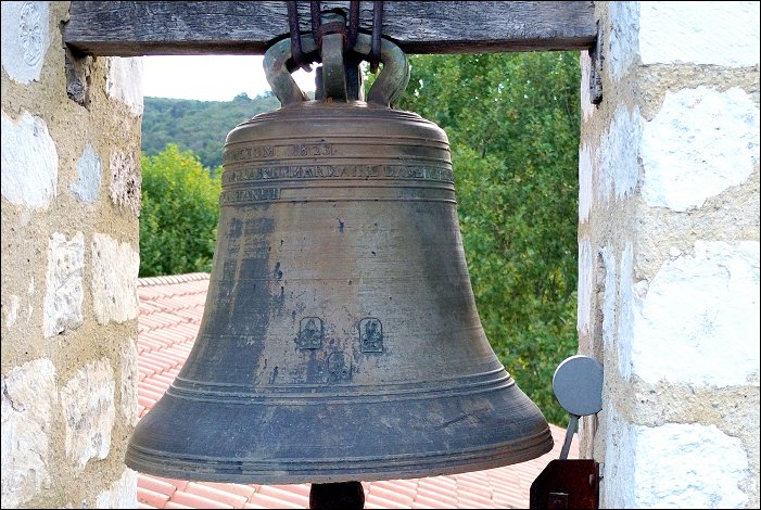 Nous y voyons deux cloches. La première est non identifiée mais elle pourra l’être ultérieurement. En effet, la robe possède une croix christique ornementée de feuilles d’oliviers. C’est très spécifique et cela correspond à Sablières et Rochecolombe. La seconde cloche est non identifiée. Elle a une décoration banale. Elle est datée de 1823, possède un trait caractéristique : un 8 aplati, 3 fleurs de lys sur la faussure. Cela devrait permettre une identification ultérieure.