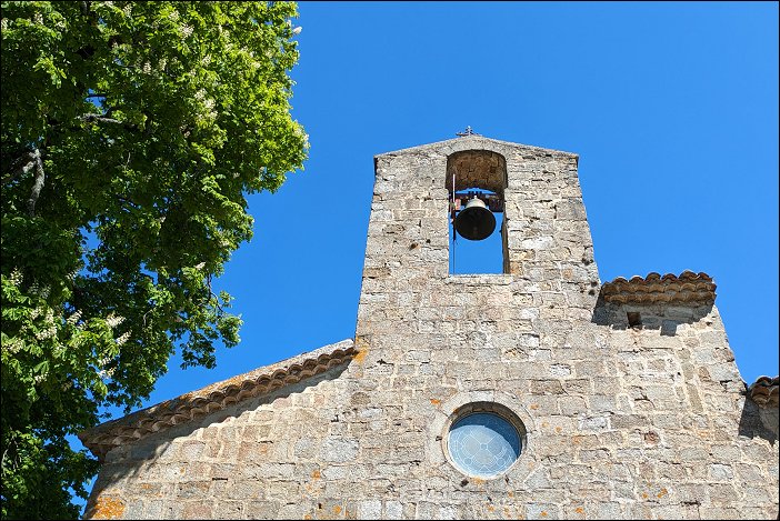 Cet édifice n’est pas prévu dans l’aire d’extension de notre étude, cela se trouve excentré. Il s’avère toutefois que nous étions de passage sur place. La cloche a été documentée au drone, car c’est un clocher-peigne. Elle n’est pas identifiée. Elle est peu conventionnelle pour l’Ardèche. D’après le peu de littérature trouvée à son sujet, elle est réputée être une Pierre Cochois datée de 1816. Elle est sonnée à la corde depuis l’entrée de l’église. Le système rudimentaire trahit un déséquilibre au montage.