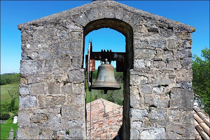 Elle a été documentée au drone, car c’est un clocher-peigne. Elle est identifiée comme étant une Gédéon Morel, au vu de son épigraphie caractéristique. Le nom de fondeur n’est pas visible. Elle date de 1839.