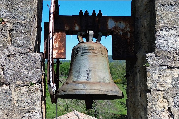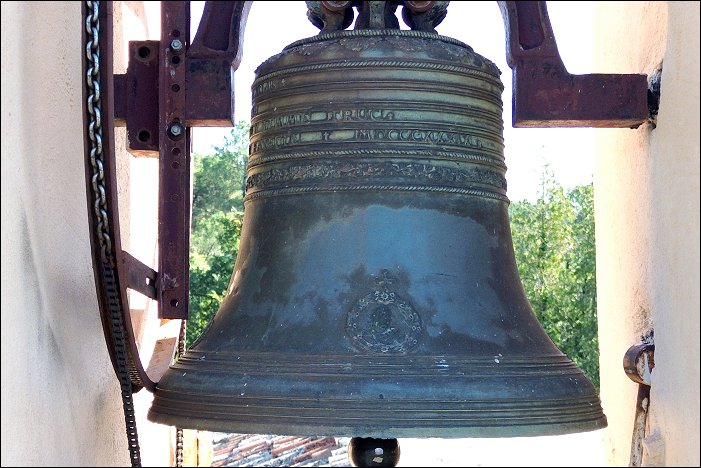 Cette cloche possède les très caractéristiques N à l’envers de la fonderie. Elle sonne entre Fa et Fa# et pèse environ 700 kg.