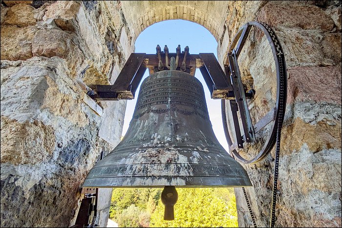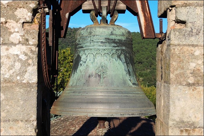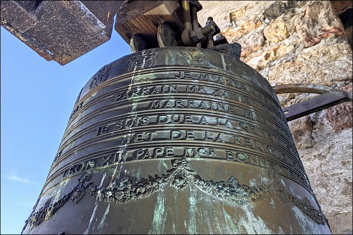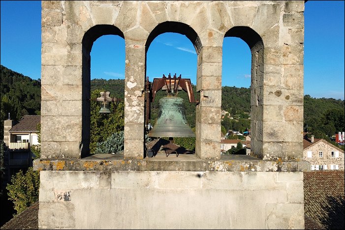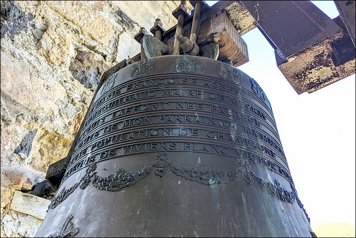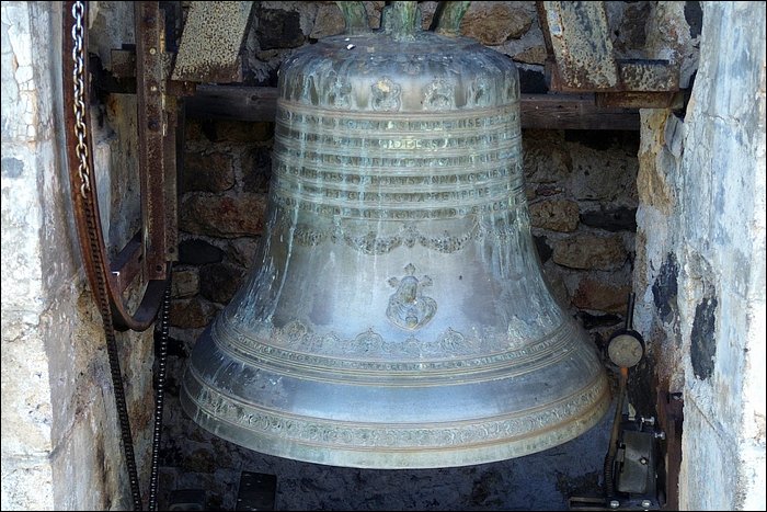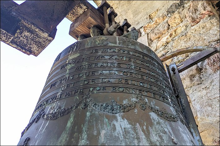 La cloche unique, accrochée dans une baie ouverte sur l’extérieur, est une belle Charles ARRAGON, et dès lors, il s’agit d’une production lyonnaise, dernière des grandes fonderies de Lyon.