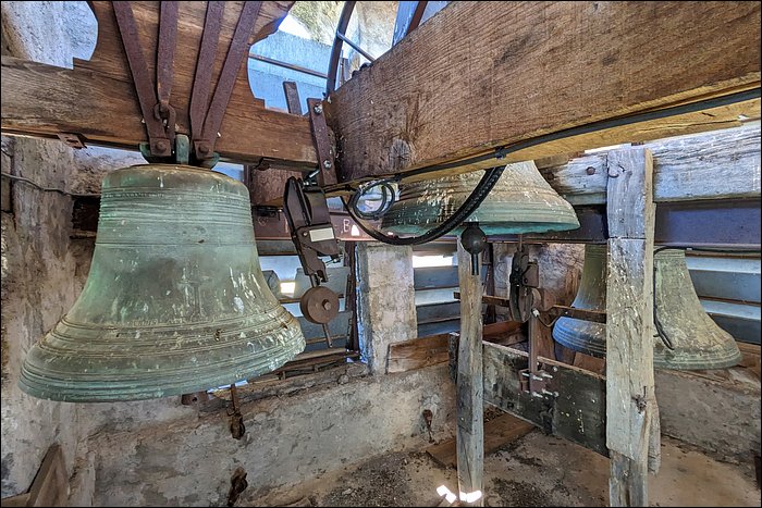 La cloche 2 sonne un Do(4) pour un poids estimé de 210 kilogrammes. La cloche 3 sonne un Ré#(4) pour un poids estimé de 125 kilogrammes. Pour la cloche du culte, le battant a été remplacé (boule Paccard) et l’entretien est parfait.