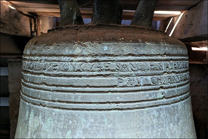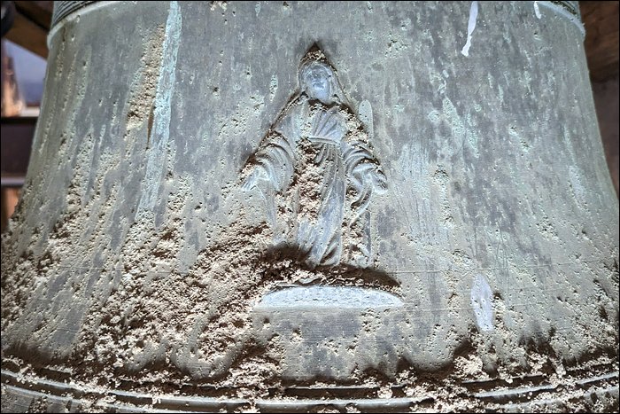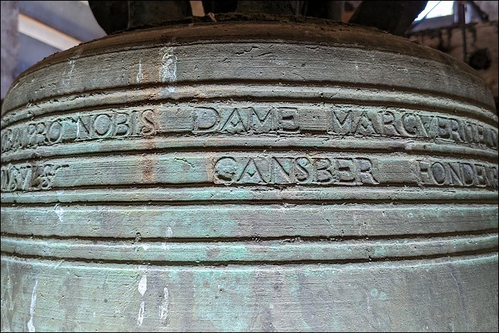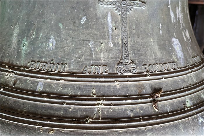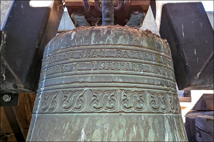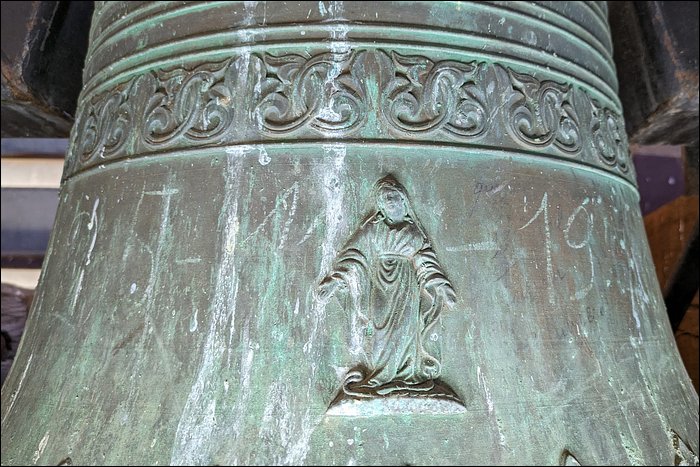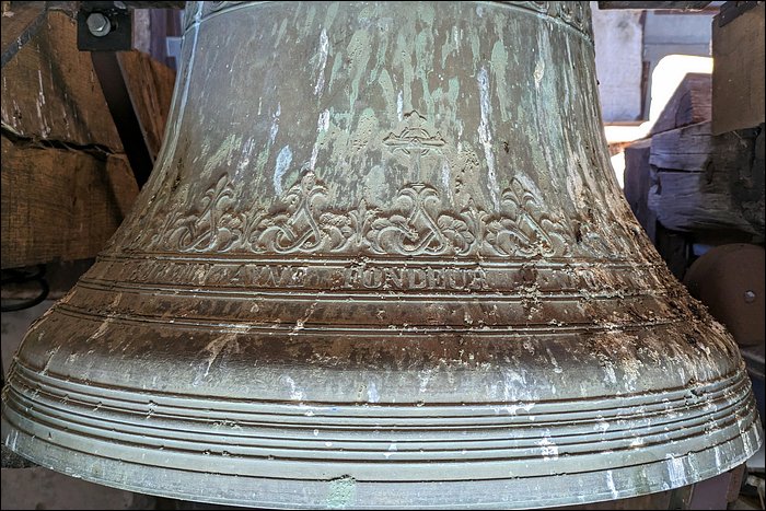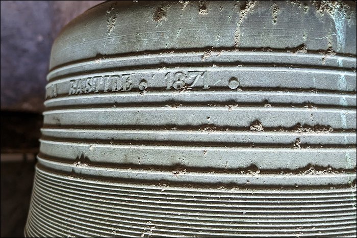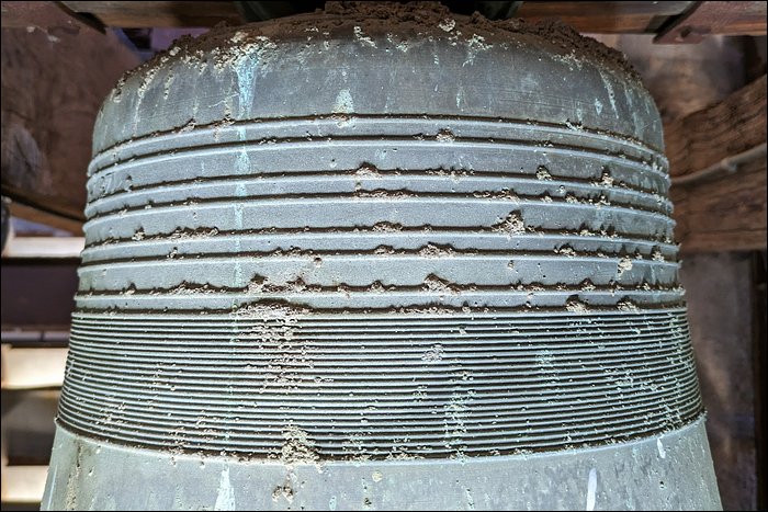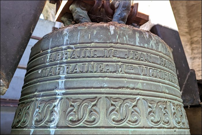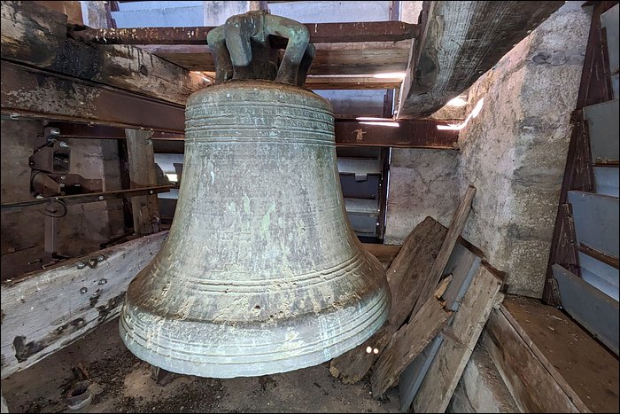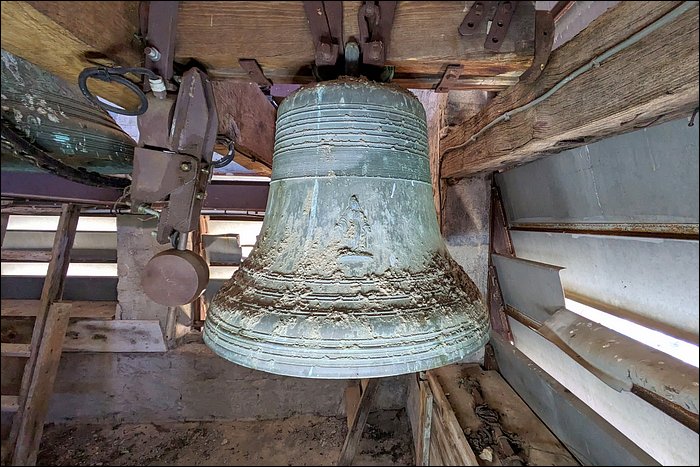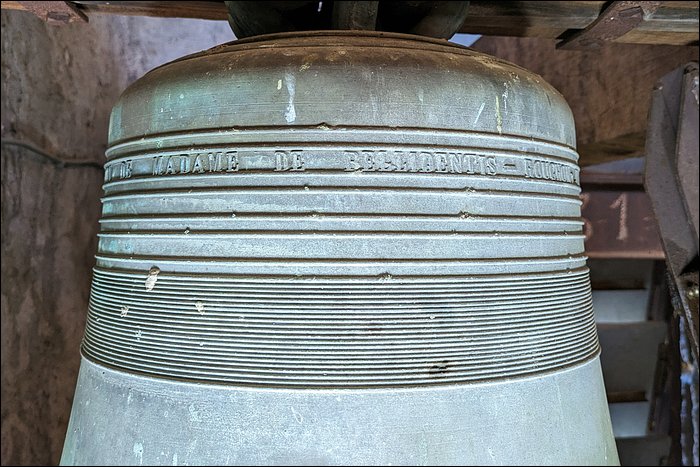Nous sommes convaincus que cette cloche est fêlée. Aussi étonnant que ça soit, nous n’avons relevé aucune trace de fêlure, pas même à l’intérieur de la robe. Pourtant, elle rend un son mat et sourd. C’est en soi caractéristique d’une fêlure, ou a minima d’une tension dans le métal ; en l’occurrence, cela pourrait justifier son placement en timbre fixe et son absence totale d’utilisation.