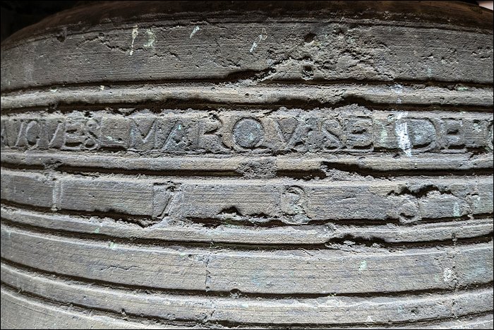 Elle sonnerait (sous toutes réserves l’on s’en doute) un La(3) pour un poids estimé de 370 kg. Le profil nous a paru archaïque, assez proche des cloches flamandes du XVIIe siècle. Au vu de la faible occurrence actuelle de ses fontes, nous pourrions avancer qu’il a acheté des planches à trousser assez vieillies, à un fondeur retiré.