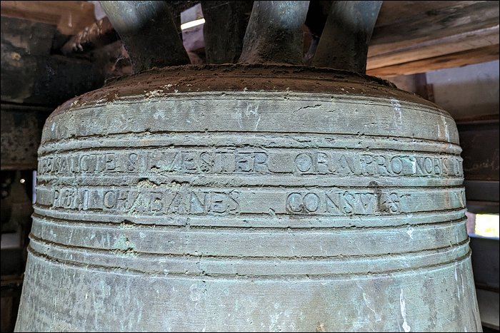 La dédicace de cette cloche est la suivante : (ligne 1) MRE FRANCOIS CHALMETON CVRE SANCTE SILVESTER ORA PRO NOBIS DAME MARGVERITE DANTRAYGVES MARQVISE DE CHOIZINET (ligne 2) P & I CHABANES CONSVLS – GANSBER FONDEVR EN 1736.