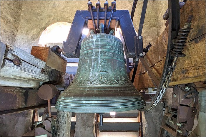 On accède au clocher par un escalier en pierres, se muant progressivement en deux escaliers en bois pentus. La chambre des cloches révèle trois instruments, dans une situation qui intrigue dès le départ : la présence d’un timbre fixe de grande dimension. Les cloches relevées sont : une Gansberg de 1736, deux Burdin de 1871.