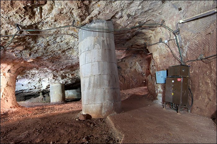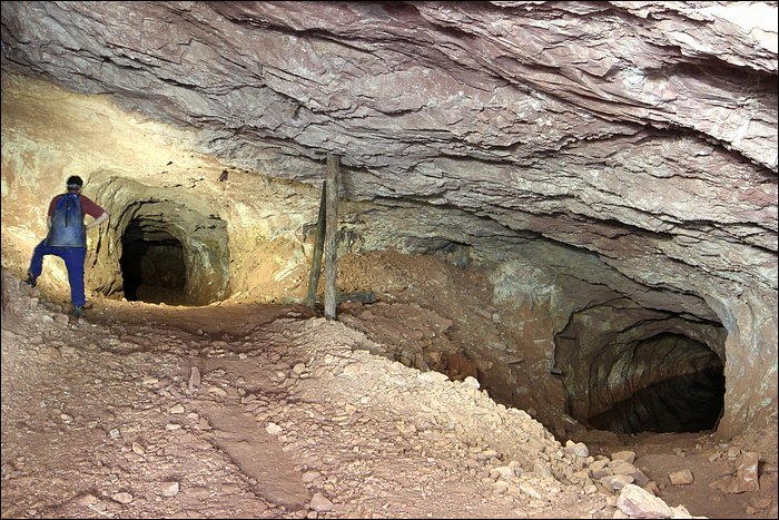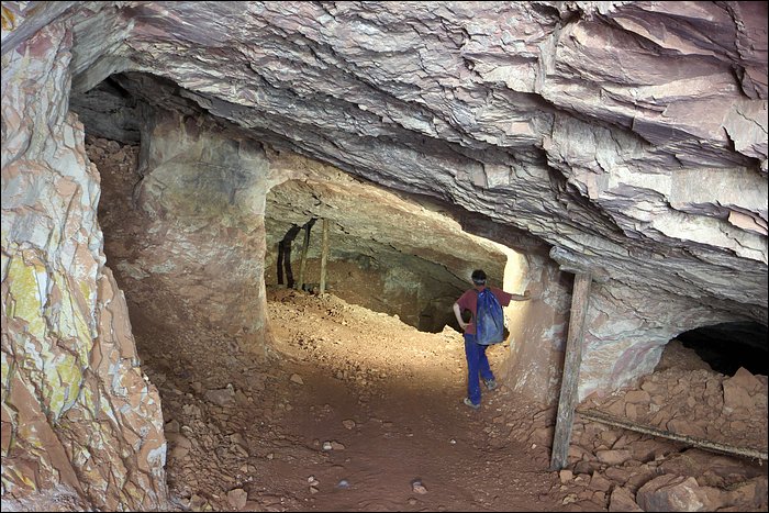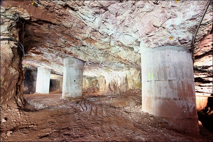 Au-dedans de la mine, c’est un quadrillage en piliers tournés le long d’un pendage de 10-15%. L’entrée 1 rejoint l’entrée 2. C’est assez petit, une demi-heure avec les photos. Quelques passages sont un peu esthétiques : piliers en béton, noyage, transformateur, ventilateur.