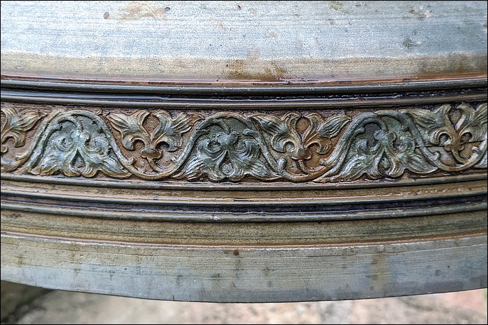 Le rinceau de fleurs de lys est ultra-typique des cloches Valeton. Nous ajouterons, avant de terminer, que l’été 1771 a été exceptionnellement chaud. Dès lors, on pourrait affirmer, peu aventureusement, que la potée a craquelé du fait d’un soleil ardent. Notons que ce n’est absolument pas rare, tout autant en Ardèche qu’en Provence d’ailleurs.