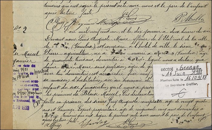 Les véritables premières traces que nous en trouvons, du moins attesté par écrit, sont celles des parents : Blaise et Rose, identifiés comme agriculteurs. Blaise Marcel est né le 9 janvier 1901 et décédé le 16 juin 1988. Il s’est marié le 23 juin 1923 à Monteux, avec Rose. Cette dernière, Rose Joséphine, est née en 1902 et décédée en 1989. Les registres de recensement laissent très clairement apparaître qu’ils sont logés au domaine. Ils sont probablement viticulteurs.