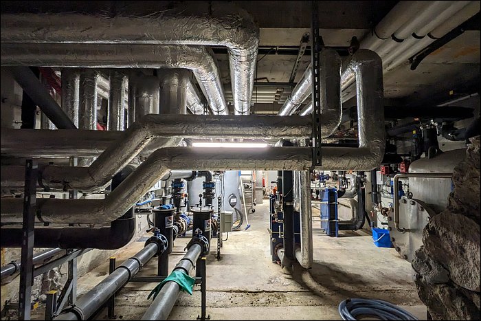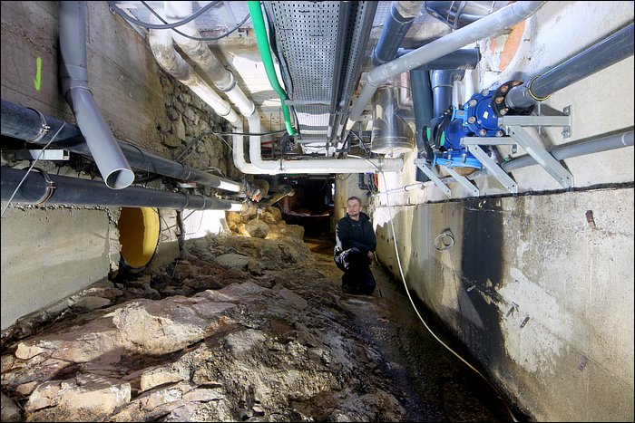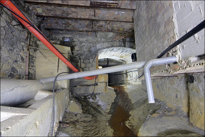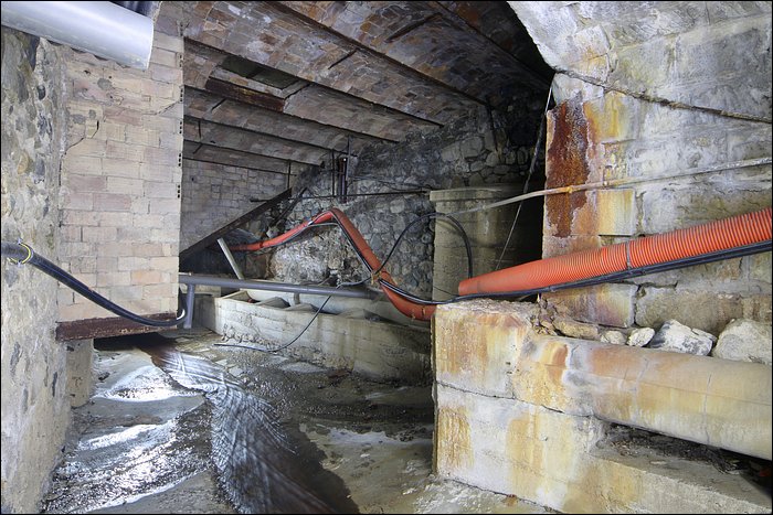 A la suite de l’utilisation, certaines eaux sont rendues, tandis que d’autres sont épurées, puis partent dans une canalisation que l’on pourrait qualifier d’égout. Le terme est impropre car les eaux ne sont pas souillées. Elles sont seulement inadéquates pour être rejetées telles quelles dans la rivière. C’est ce qui explique la profusion esthétique de tuyaux, en d’autres lieux certains rejets naturellement minéralisés et colorés.