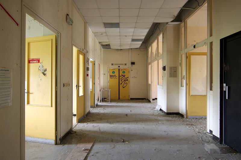Dedans, il faudra vite cartographier mentalement les couloirs, dans le but d’échapper aux casseurs, aux squatteurs. Les hôpitaux sont immensément majoritairement enfouis dans un tissu urbain dense, cela attire irrémédiablement toute la racaille possible et imaginable. L’hôpital abandonné concentre souvent tout ce qu’on peut de danger, entre les toxicos agressifs et les pilleurs violents. Une urbex dans un hôpital n’est pas forcément recommandable pour un débutant.