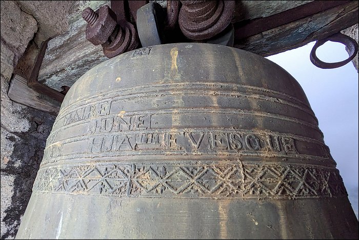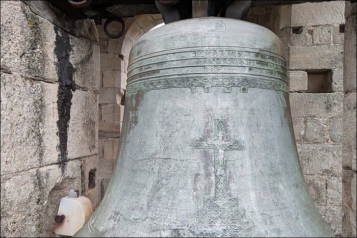 Elle sonne un Sol(3) étonnamment juste, pour un poids de 530 kilogrammes en profil plutôt léger. Le battant est d’origine, tout autant que le mouton, qui semble retravaillé par un ajout d’équilibrage, daté dans la décennie 1840 (un tirant passe devant le dernier chiffre). Le rétro-mitigé est très lent.