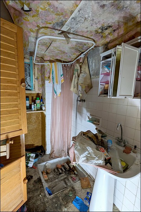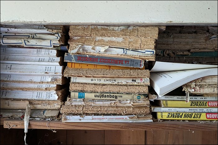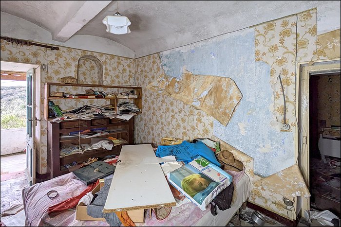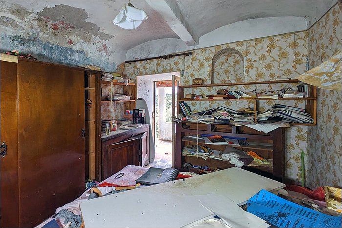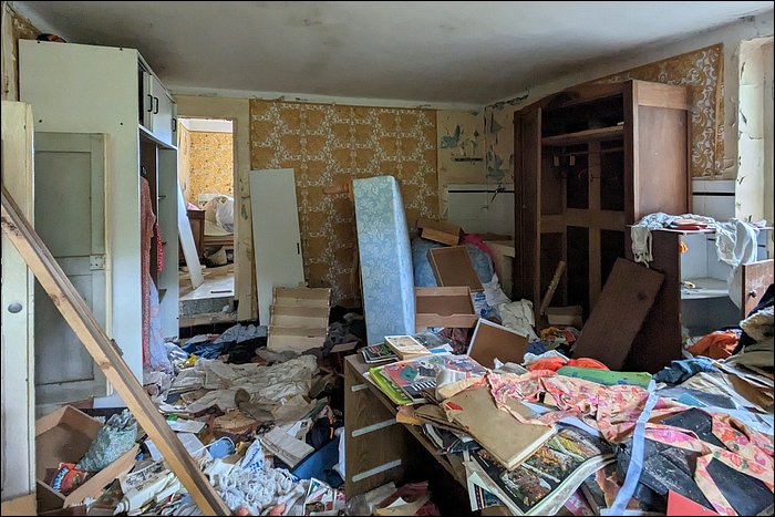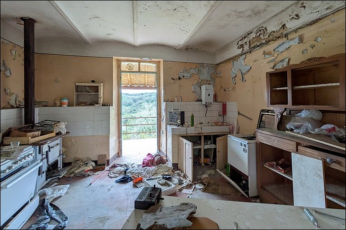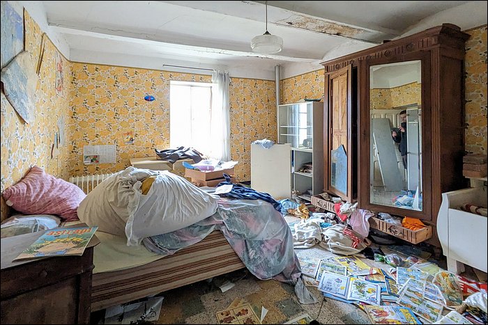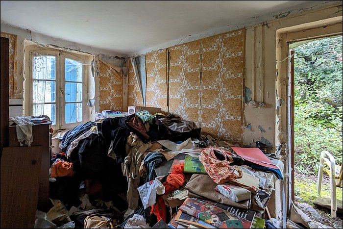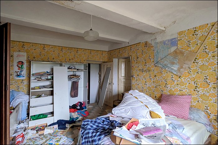 Au vu de l’état de dégradation, ça fait longtemps que les derniers occupants ont dû partir. Souvent, c’est à l’état du jardin que l’on arrive à dater ça, plutôt que les extérieurs. On parlerait ici de 10 ans ou quelque peu plus, ça ne serait en rien étonnant. La maison est dans état de dévastation ultra-intense. Ils ont tout pillé, tout dégradé, tout souillé.