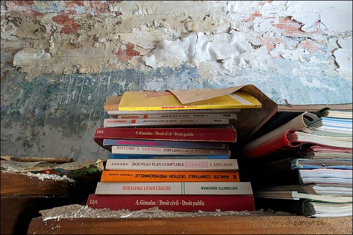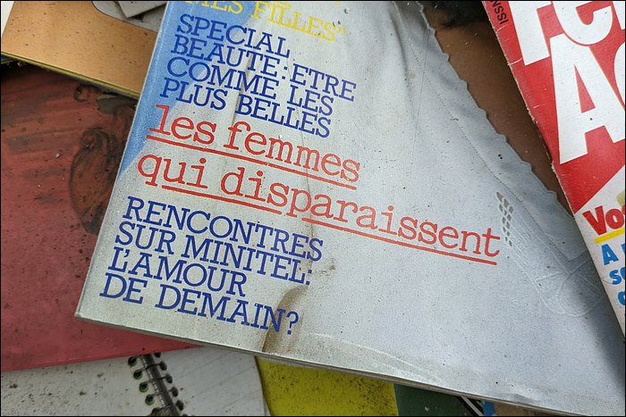 Premièrement Marielle. Il se pourrait « éventuellement » qu’elle ait été l’occupante principale des lieux. Dans la maison subsiste des cours de comptabilité, ainsi qu’un rapport de stage à intermarché. Cette maison révèle un nombre très impressionnant de revues « Femme actuelle » ainsi que des romans Harlequin en pagaille. Il ne fait nul doute, considérant l’esthétisme d’ailleurs, que c’est une maison de femme.