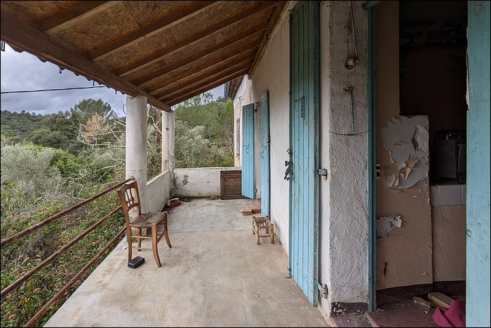 Le long d’une route au final assez passante, un chemin discret permet de monter à la maison, franchement en retrait dans la garrigue. L’allée bitumée, autrefois qualitative, est aujourd’hui partiellement défoncée, encombrée de petites roches et surtout largement piétinée par les sangliers. Un secteur montre des troncs d’arbres complètement dénués d’écorce et souillés par une boue collante. Le passage est récent. La maison a toutes ses portes et fenêtres ouvertes, c’est dans un état d’abandon extrêmement virulent.