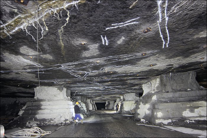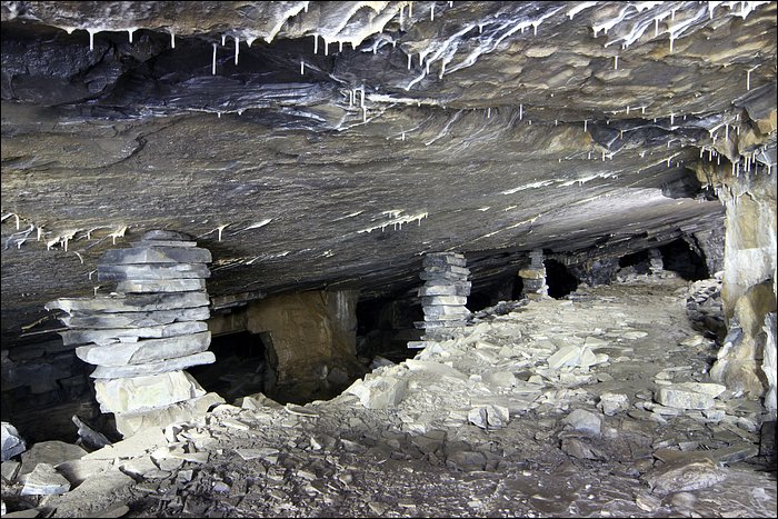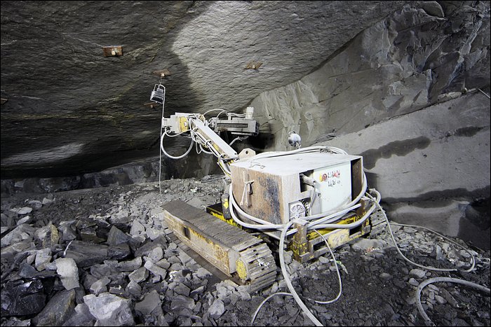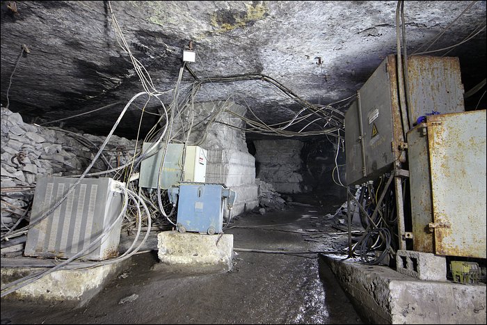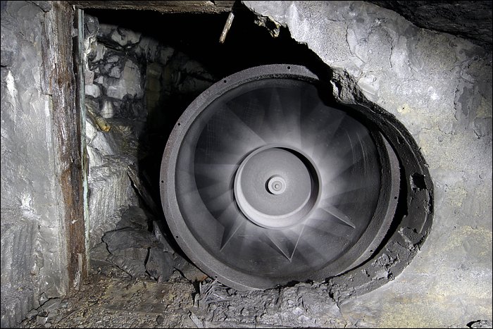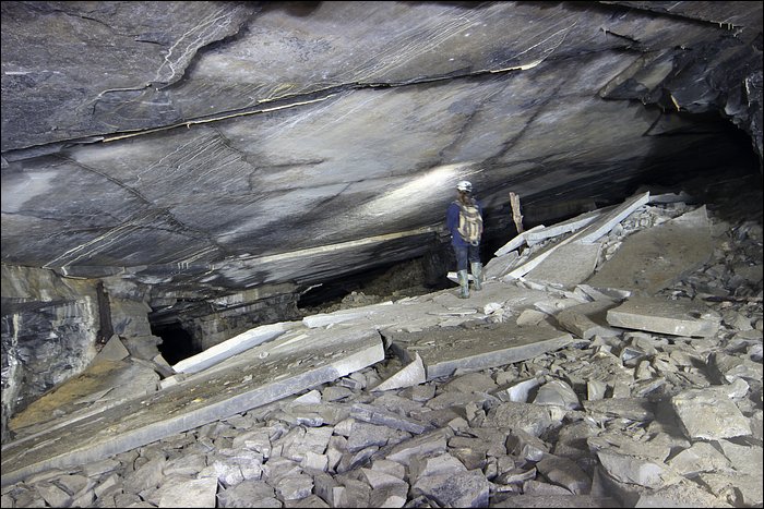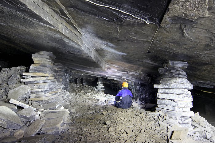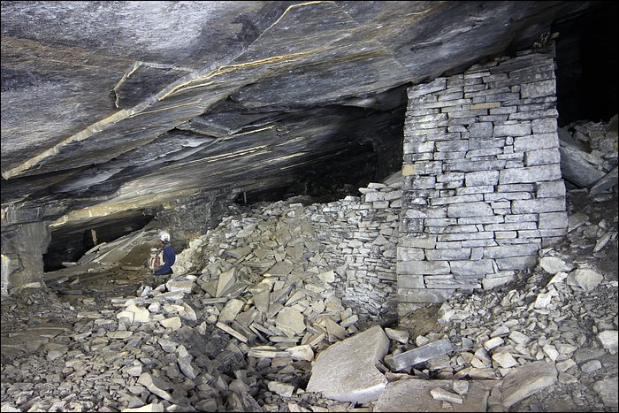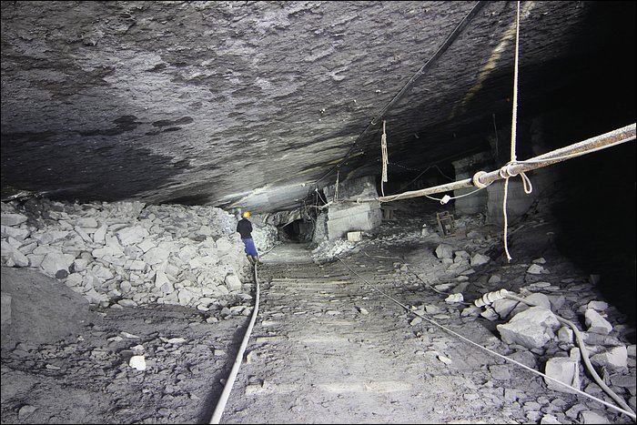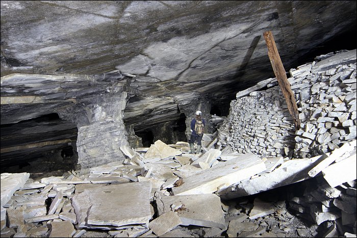 Il existe tout un quartier, que l’on décrirait avec amateurisme comme étant une route secondaire, qui donne accès à des chantiers d’exploitation plus anciens. De nombreux départs de galeries sont remblayés avec les déchets de pierres. On entre comme soudainement, sans transition, dans un ensemble de tunnels à la fois vaste et très calme. Ici le temps s’est arrêté, le silence est omniprésent, ça n’a plus rien à voir. Un des tunnels débouche sur un puits d’aération, tout petit. Loin de la démesure, ce sont des paysages souterrains originaux et franchement jolis.