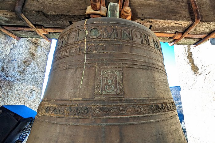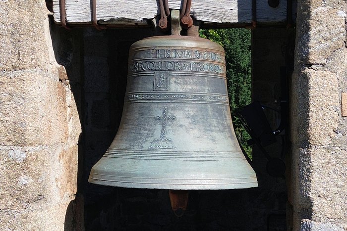 La cloche ici présente est en profil renforcé, voire même potentiellement en profil lourd sous réserve de mesures. Ne sonnant jamais en volée, et n’ayant d’ailleurs pas même de volant, elle possède un battant forgé qui sort de toute forme habituelle. Il ne serait pas d’origine, mais au moins très ancien. Le baudrier est turbo-cuit, cela s’avère sans conséquence sur l’avenir considérant l’absence de volée.