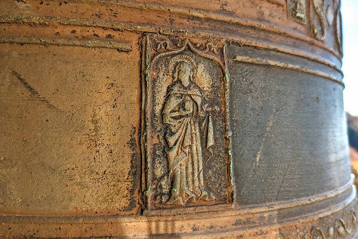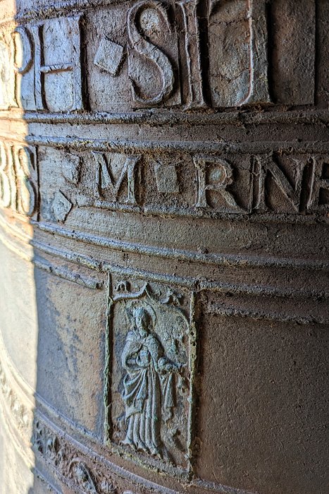 La grande cloche date de 1664. On y aurait « vraiment » volontiers vu une Dupuy Chassiers. Tout le piège est là : une grande réussite épigraphique, des rinceaux concordants, le village de Chassiers est proche, la date correspond à la fin de la dynastie. Sauf qu’un problème se pose d’emblée, l’effigie de Saint-Jean-le-Baptiste à trois jambes n’est pas présente. Or, on le sait et le redit : les Dupuy sont des monomaniaques de la décoration. Toutes les cloches sont identiques, pas une n’a dérogé.