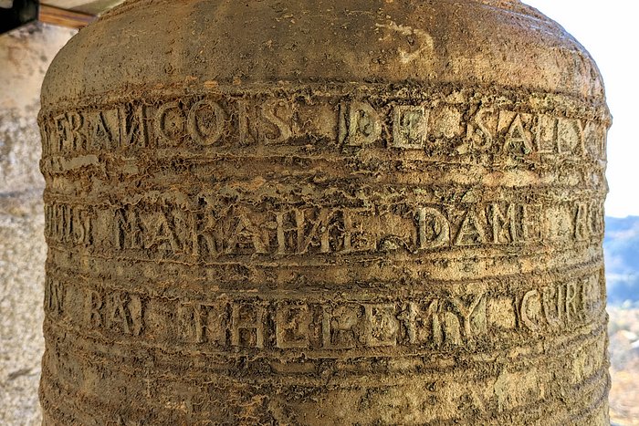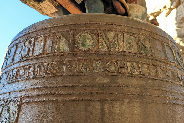 La dédicace est la suivante : (Ligne 1) + IHS MARIA IOSEPH SIT NOMEN DOMINI BENEDICTVM (Ligne 2) S GREGORI ORA PRO NOBIS M RNE MARCHAL F 1664. L’inscription M RNE MARCHAL F signifie Magister (le maître-fondeur) René Marchal FECIT (m’a faite). Sans grands efforts, on découvre qu’il s’agit d’un fondeur en provenance du Puy-en-Velay.
