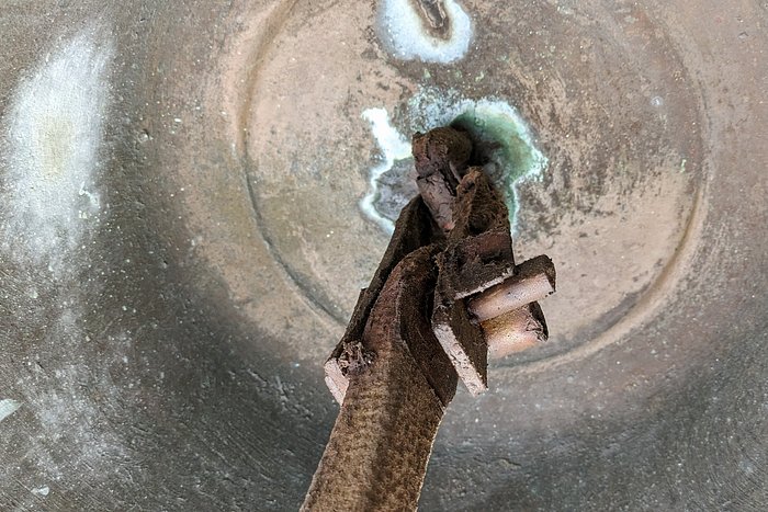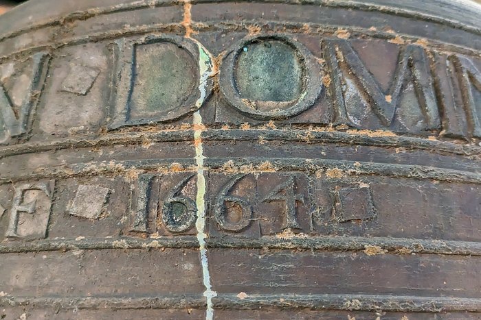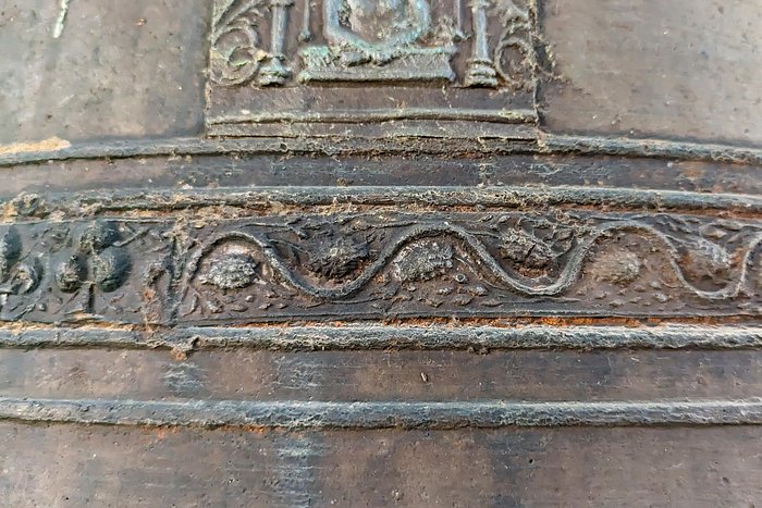 La cloche démontre les traditionnelles lacunes, notamment des problématiques de métallurgie majeures. Tout comme à Chazeaux, la potée a été catastrophique, manquant férocement d’argile. Ca donne une panse maculée de stries, de bulles, des lettres gaufrées de surplus de métal. Au-delà, on relève une couleur très significative de manque d’étain. Ils ont monté le feu trop chaud, perdu un max d’étain par évaporation, laissé l’étain trop longtemps, et coulé à la louche trop froid.