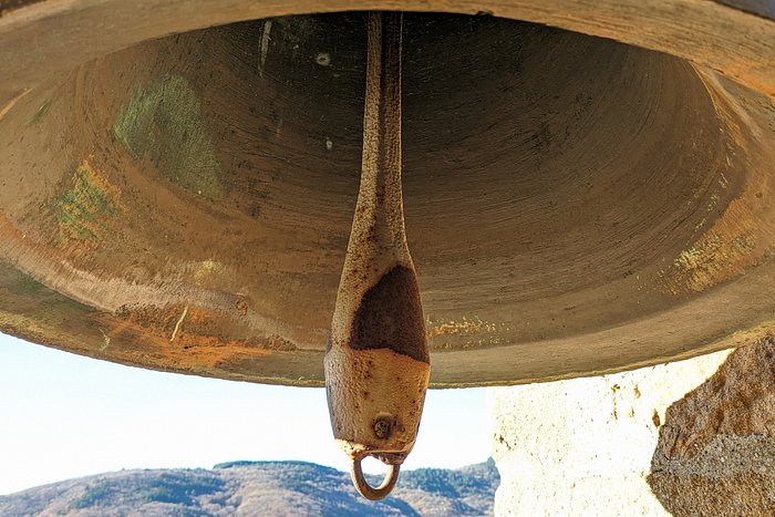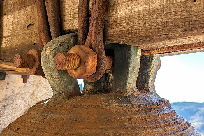 Une cornière est fixée entre le mur et le mouton, au niveau des paliers et tourillon, provoquant l’impossibilité de sonner en volée. Il est à supposer que le vent déplaçait la cloche, celle-ci étant en profil ultra-léger. Du coup, j’ai sonné un angélus dessus.