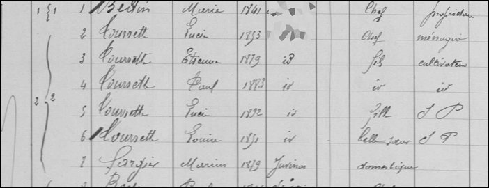 On notera immédiatement l’absence du père de famille, Louis Ferdinand, que nous pouvons supposément considérer comme étant décédé (non confirmé aux AD, ne possédant pas la date).