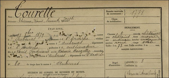 Lors du recrutement militaire (AD ARD classes 1887-1921) Etienne est décrit : cheveux châtains, yeux marrons, front moyen, nez ordinaire, bouche moyenne, menton rond, visage ovale, taille 1m73. On ne peut plus ordinaire. Il sait lire et écrire.