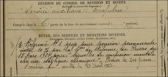 Il est décrit de la sorte « séquelles de confusion mentale chez un éthylique chronique ». Il est mentionné le terme « scrofulose », que nous pourrions être tenté de définir par : moralement contaminé. Plus bas, il est encore mentionné « 1916 troubles mentaux, hôpital militaire de Marseille » « interné du 10 août 1915 au 20 juin 1916 ».