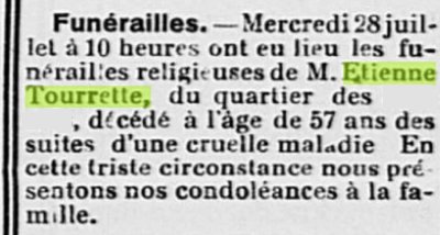 La lignée TOURRETTE est allée vers un effondrement. Aucune sépulture TOURRETTE n’est visible au cimetière de la ville concernée (relevé du 29 novembre 2025), alors que nombre d’autres sépultures mentionnent des dates de naissance antérieures à 1879. Ceci n’exclut pas une reprise de concession, ceci étant. Le monument aux morts ne mentionne aucun TOURRETTE.