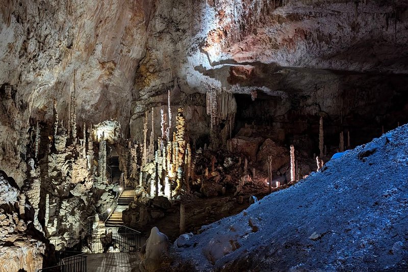 La visite souterraine, c’est une cathédrale minérale. La descente commence par un ascenseur panoramique qui vous fait perdre 120 mètres en quelques secondes. Vous pouvez aussi choisir les 350 marches si vous voulez faire un peu de sport. Dès la sortie de l’ascenseur, vous êtes dans la gigantesque Salle de Joly (ou Salle Rouge), haute de plus de 50 mètres et longue de 125 mètres. L’éclairage met superbement en valeur les draperies orangées et les énormes stalagmites.