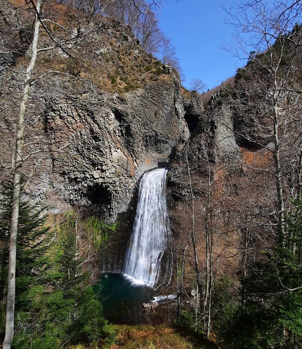 Der Wasserfall entsteht am Fluss Bourges, der inmitten beeindruckender Basaltsäulen entspringt – sechseckigen Formationen aus schwarzem Basalt, die aus einem alten vulkanischen Lavastrom entstanden sind. Dieser Ort hat seinen Ursprung im Vulkan Ray-Pic, auch bekannt als Fialouse-Lavastrom, einem der längsten in Europa mit einer Länge von etwa 20–21 km.