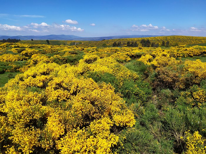Après Montselgues, c’est très spécial pour la floraison des genets, mais la période n’est pas facile. En gros, c’est à peu près entre mi-mai et début juin. Les steppes se couvrent incroyablement de jaune. C’est complètement unique et magique. Le problème, c’est la variabilité, selon le climat de l’année. Certaines années où il fait froid, ça s’étale sur plus d’un mois et il y a peu de fleurs. D’autres années à la chaleur affirmée, c’est concentré sur une quinzaine de jours et c’est splendide. Le tout c’est de bien tomber dedans.