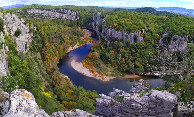 Der sanft ansteigende und einfache Weg versprüht viel mehr provenzalisches Flair als das Labyrinth. Er ist sonnendurchflutet. Der Pfad führt zu einem herrlichen Aussichtspunkt mit Blick auf die Chassezac-Schlucht und bietet ein atemberaubendes Panorama. Ein 180-Grad-Blick auf den türkisfarbenen Fluss, die Felsen und die Kletterer. Das Klettergebiet liegt direkt gegenüber. Ein so weites Panorama ist selten ; man fühlt sich wie in einer echten Schlucht.